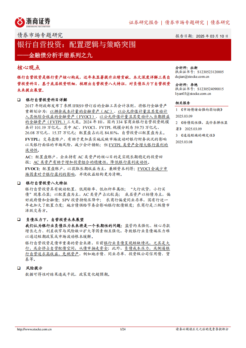 今天分享的是:金融债分析手册系列之九:银行自营投资:配置逻辑与策略突围
